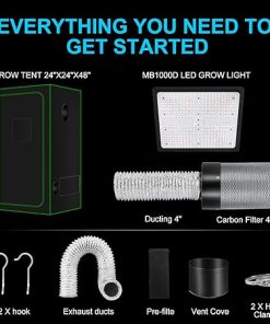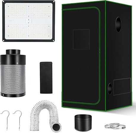 - Everything You Need in One Kit: This complete setup includes a 24x24x48-inch grow tent, a 4-inch 190 CFM inline fan, a carbon filter, 16.4 feet of ducting, 2 stainless steel clamps, a rubber pipe coupling, and a 100W LED grow light, ensuring you have all the essentials for a successful grow.